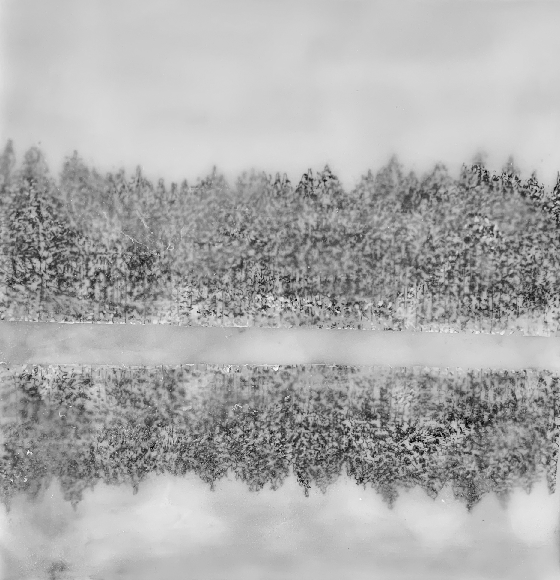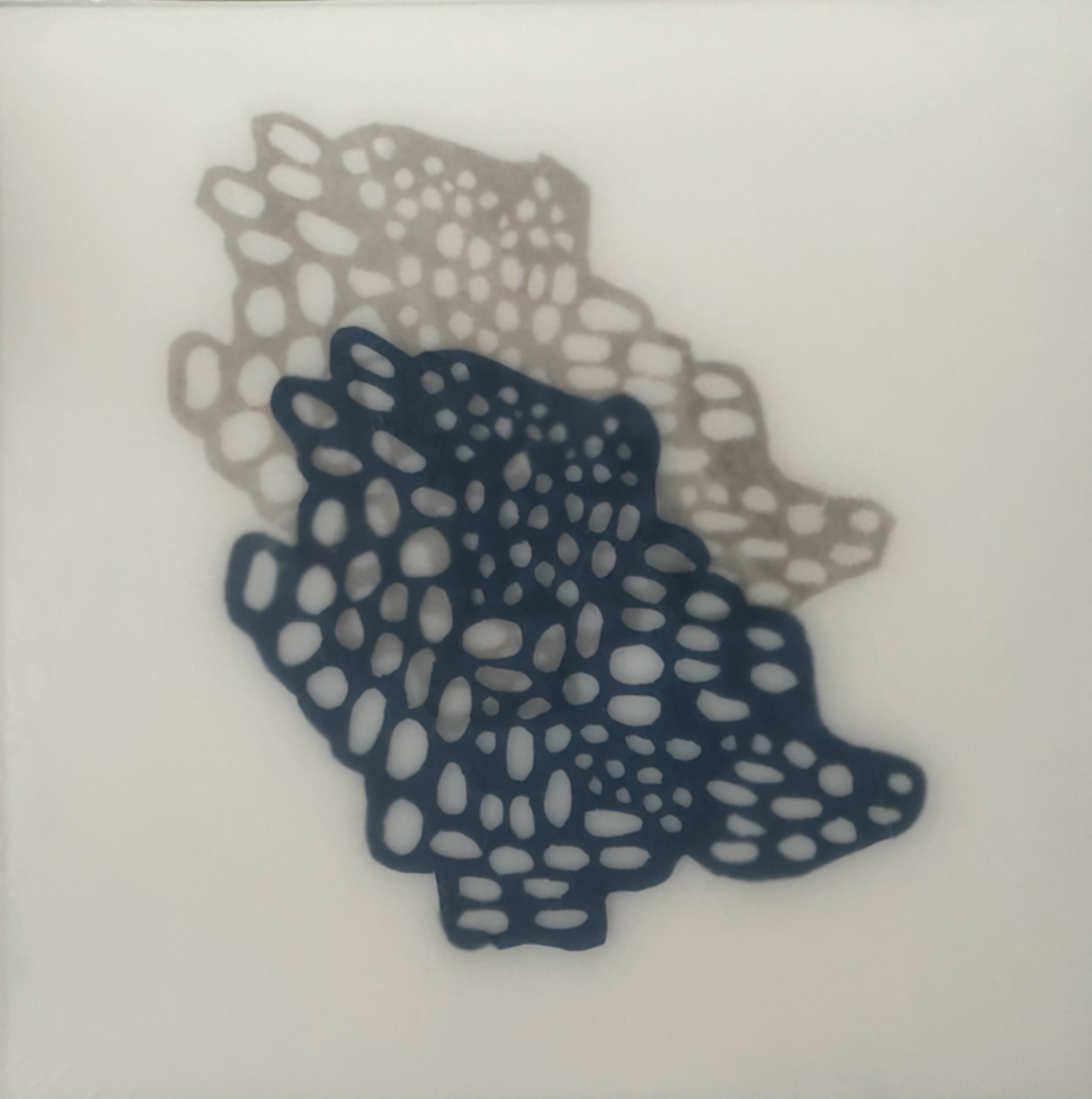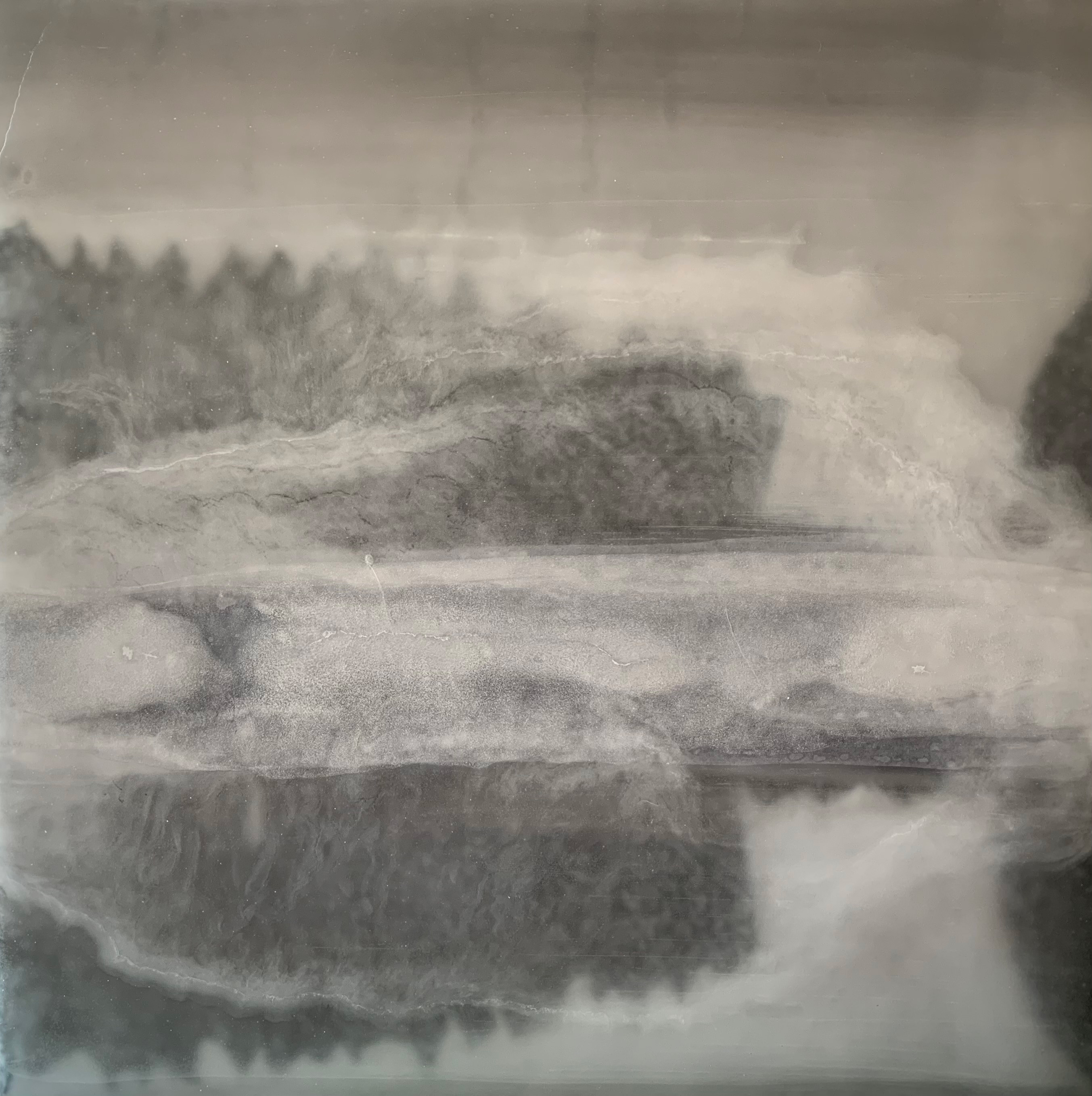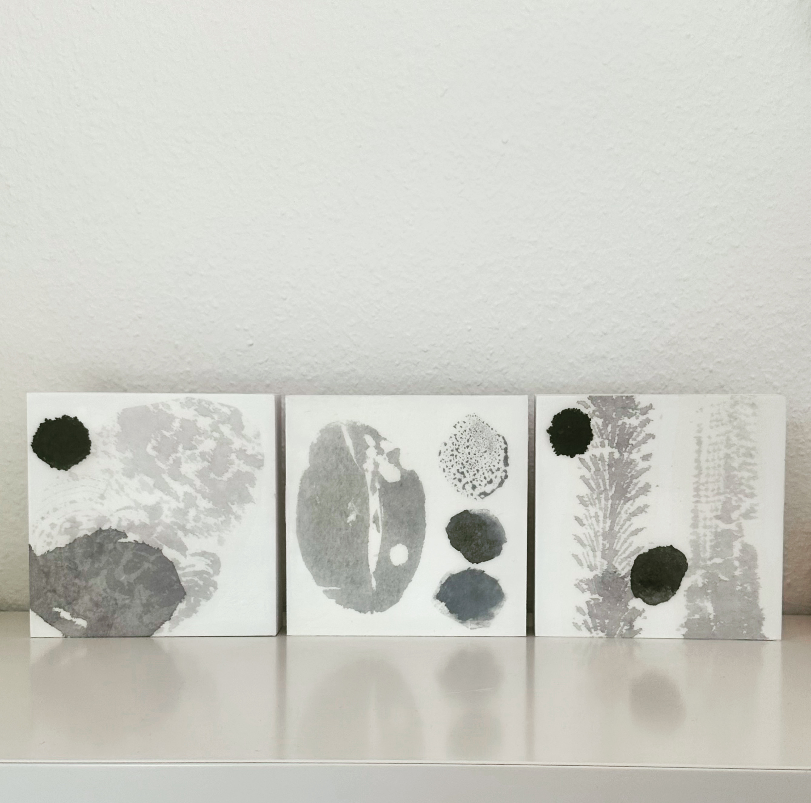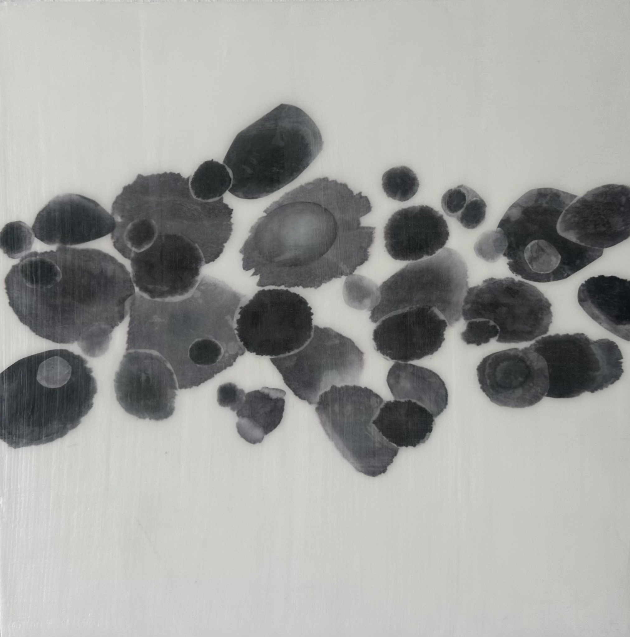 "The haptic Quality of the wax gives the object asensual physicality." (Edda Jachens) Wooden shelves painted or collaged with acrylic and ink were brushed or poured over it with hot wax. "The milky transparent layers of wax give the pictures an enchanted mood or restraint, something mysterious. The inside of the picture is protected, the outside, the layer of wax, is vulnerable and unprotected. The painting underneath appear velvety and their outlines appear strangely mysterious." (Edda Jachens)( Neuer Kunstverein Aschaffenburg)
